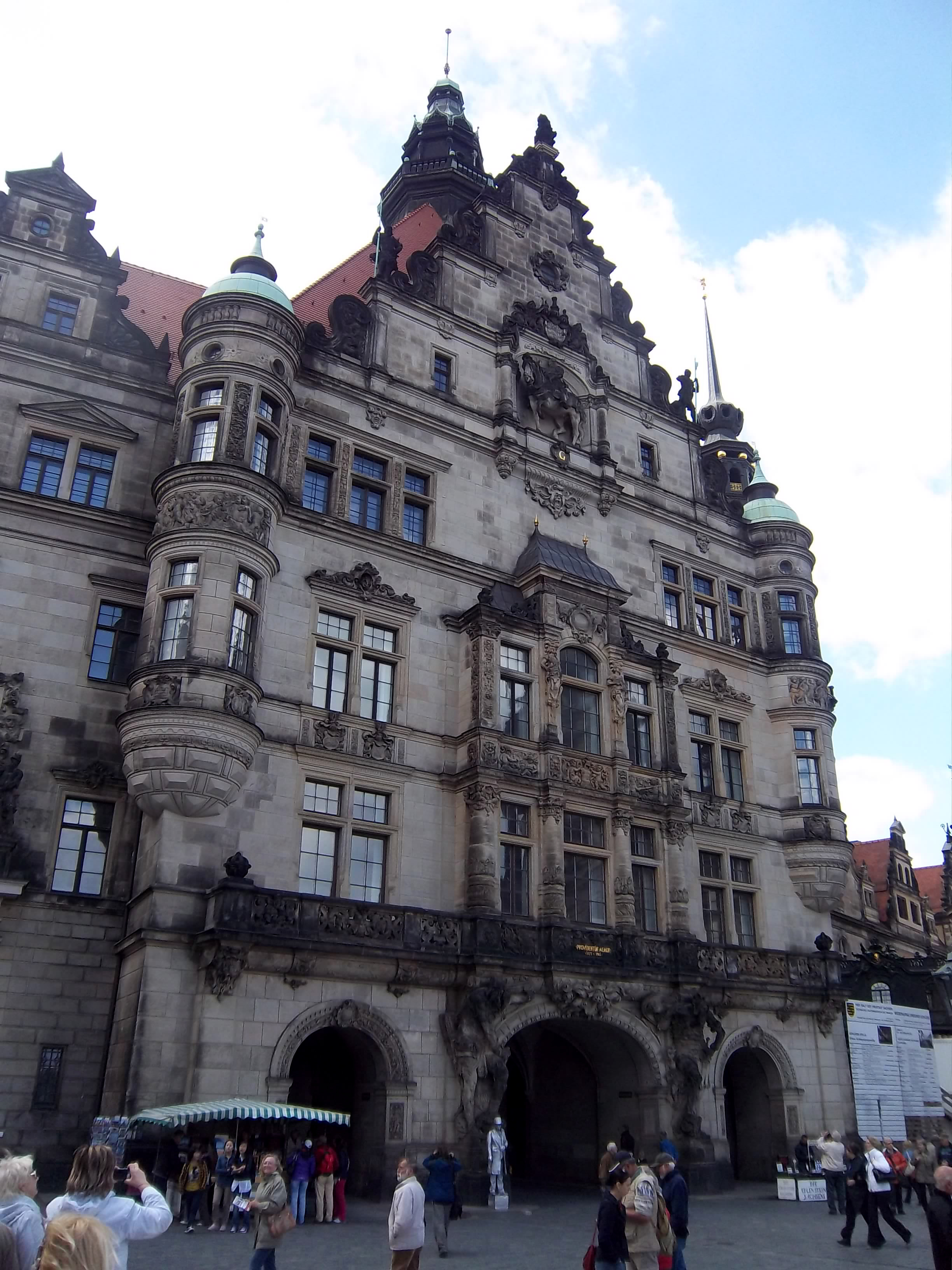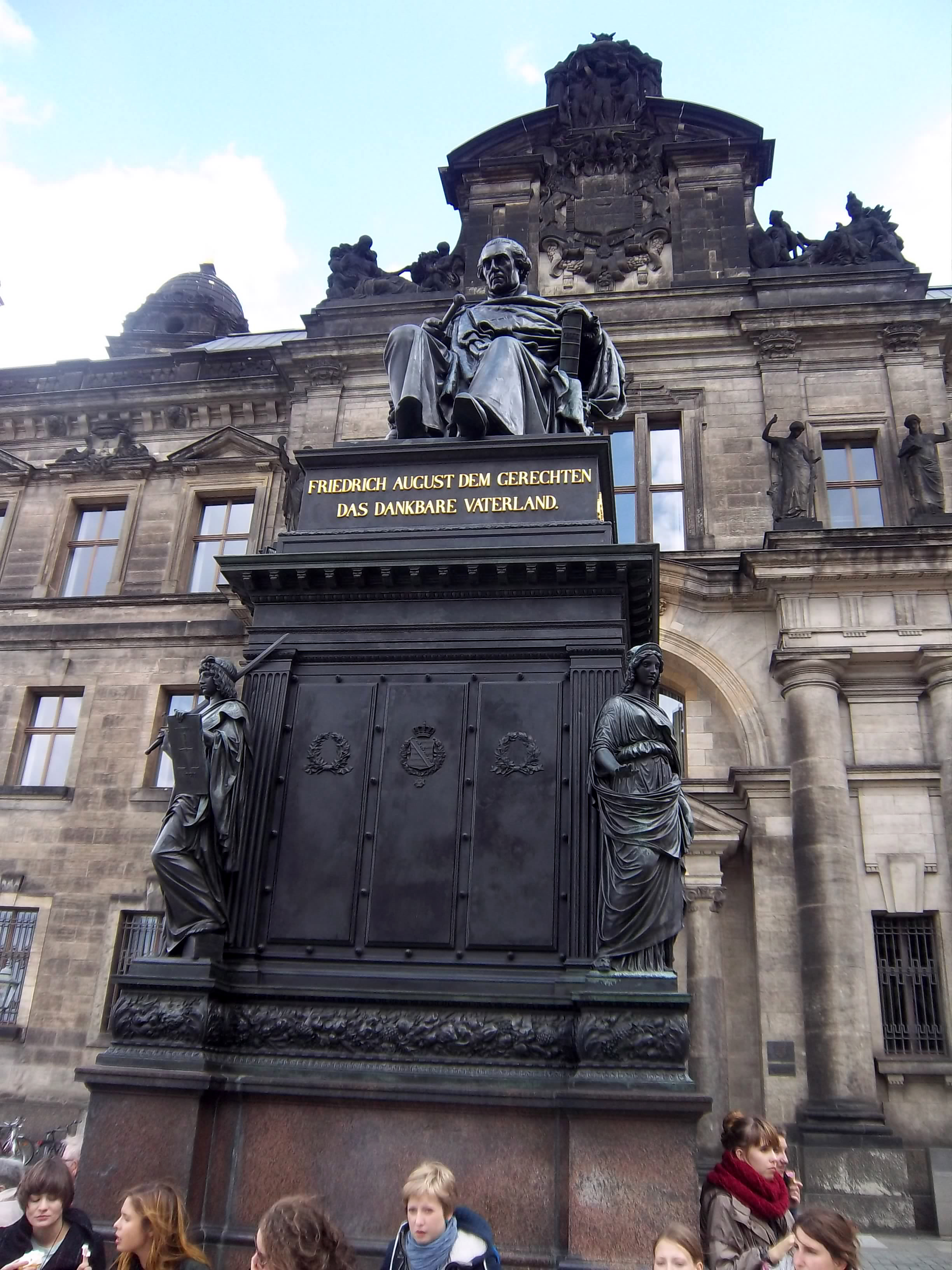 Wir zurück auf die andere Seite, zum beliebten Treffpunkt Friedrich-August-Denkmal hin und zufällig stießen wir auf unsere Dozentin, die uns – ziemlich unwirsch – sagte, dass wir uns um Viertel vor an der Treppe daneben träfen. Maja hatte aber zuvor die vor der Kirche stehenden Pferde gestreichelt und wollte sich die Hände waschen. Wir also ins Residenzschloss hinein, wo es extrem voll war und wir Mühe hatten, zum Waschbecken vorzudringen. Also kamen wir drei Minuten zu spät zum vereinbarten Treffpunkt, an dem keiner mehr war. Maja bekam Angst, dass die Dozenten langsam sauer auf sie würden, weil sie mit der Bibliographie in ihrem Referat etwas geschludert hatte. Wir rannten die Treppe hinauf, weil eigentlich der nächste Punkt die dortige Brühlsche Terrasse hätten sein sollen. Kein Kursteilnehmer weit und breit zu sehen.